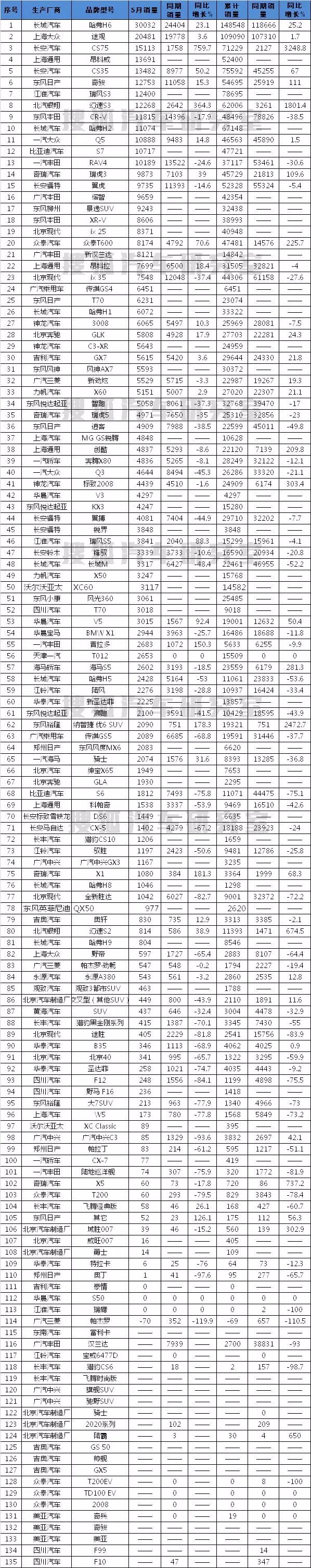 5月国内SUV销量排行