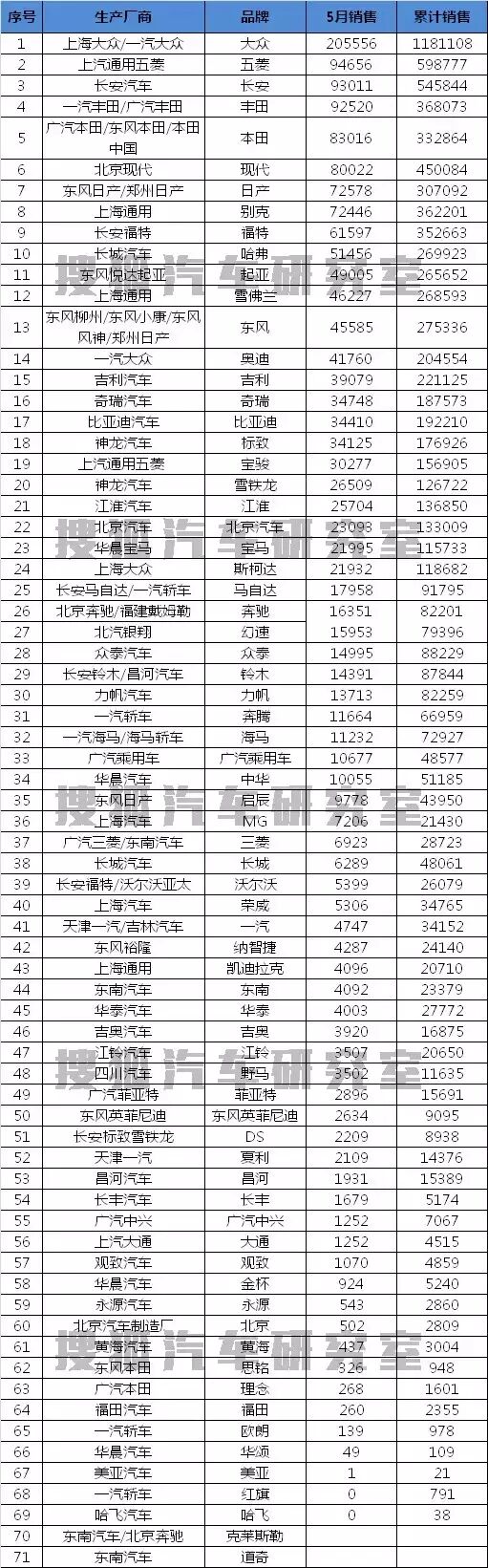 5月国内乘用车品牌销量排行